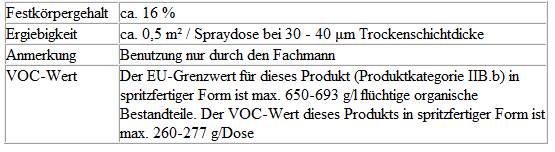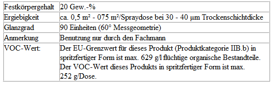 Bei diesem Produkt handelt es sich um eine, mit einer speziell auf das "Aquaplus-System" und "Aqua-Premium-System" abgestimmten, Treibgas und Lösemittel-Kombination vorbefüllte Lacksprühdose.