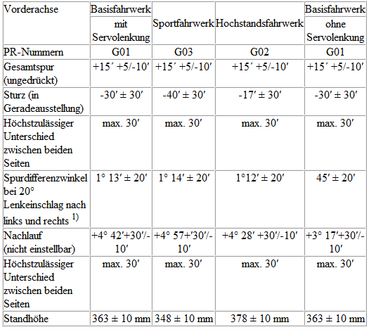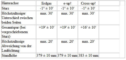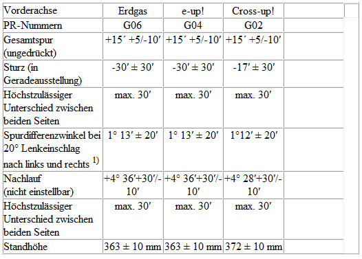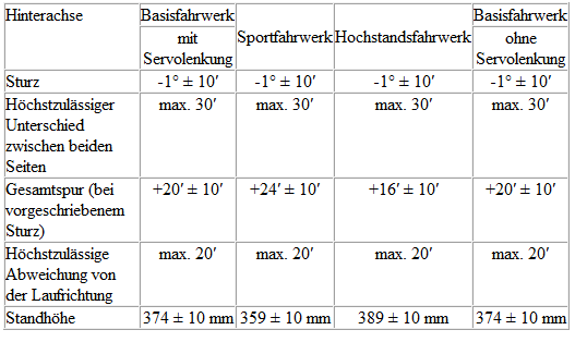 Diese Sollwerte gelten für alle Motorisierungen bei "Nulllage" der Fahrzeugquerneigung.