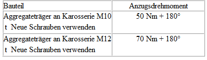 - Aggregateträger mit neuen Schrauben an Karosserie mit dem Weiterdrehwinkel festschrauben.