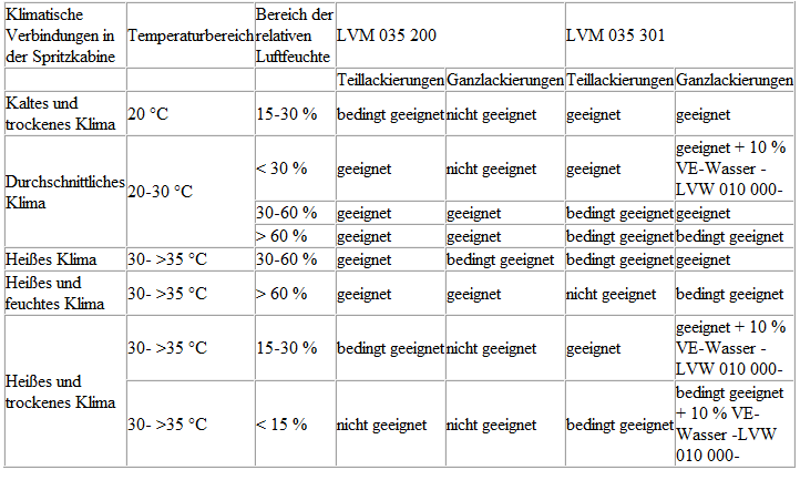Die in der Tabelle angegebenen Bereiche für Temperaturen und Luftfeuchten sind grobe Richtwerte und sind immer von den lokalen Gegebenheiten abhängig. Sie haben Luftvolumenstrom in der Kabine wie auch Lackierpistolen (Typ und/oder Düsengröße) und auch die Applikation selbst einen großen Einfluss auf Filmbildung und Qualität der Beschichtung.