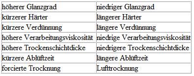 Der Einsatz von anderen, in diesem Merkblatt nicht genannten Härtern, Verdünnungen ist grundsätzlich möglich, kann jedoch, wie auch unterschiedliche Auftragsarten, Trocknungsbedingungen und Schichtdicken zu unterschiedlichen Glanzgraden (bis zu 20 %) führen.