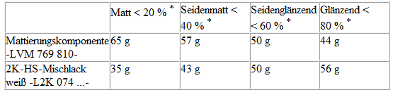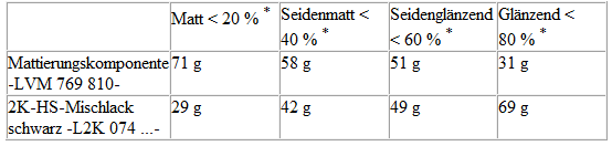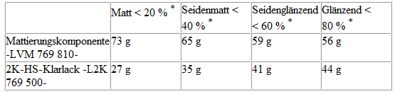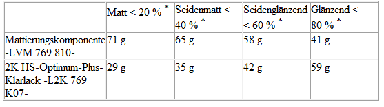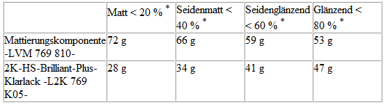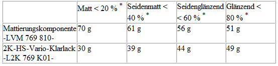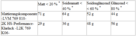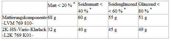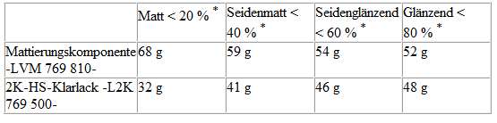 Je nach gewünschtem Glanzgrad werden Mattierungskomponente -LVM 769 810 A2- und 2K-HS-Klarlack -L2K 769 500 A5- im Gewichtsverhältnis von 75/25 % bzw. 70/30 % gemischt.