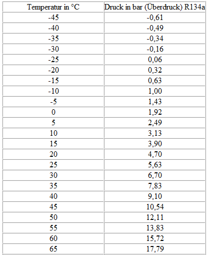 Dampfdrucktabelle für Kältemittel R134a