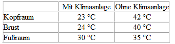 Durch eine geregelte Klimaanlage in Verbindung mit einem gut durchdachten Heizungs- und Lüftungssystem kann das Gefühl des Wohlbefindens und der Behaglichkeit durch Regelung der Innenraumtemperatur, der Luftfeuchtigkeit und der Luftbewegung, entsprechend den äußeren Bedingungen, erzeugt werden. Diese sowohl bei stehendem als auch fahrendem Fahrzeug.