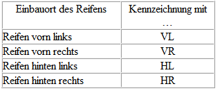 - Bei nicht laufrichtungsgebundenen Reifen darauf achten, dass alle DOT-Bezeichnungen am Reifen nach außen zeigen. Möglicherweise wurde am Fahrzeug bereits zu einem früheren Zeitpunkt ein Reifen- bzw. Rädertausch vorgenommen.