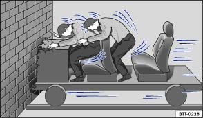 Fahrzeuginsassen, die ihre Sicherheitsgurte nicht angelegt haben, sind also nicht mit ihrem Fahrzeug verbunden. Bei einem Frontalunfall werden sich diese Personen folglich mit der gleichen Geschwindigkeit weiterbewegen, wie sich das Fahrzeug vor dem Aufprall bewegt hat, bis sie etwas aufhält! Da die Fahrzeuginsassen in unserem Beispiel keine Sicherheitsgurte tragen, wird im Falle eines Aufpralls die gesamte Bewegungsenergie der Fahrzeuginsassen nur durch den Aufprall an die Mauer abgebaut ⇒ Abb. 41 .