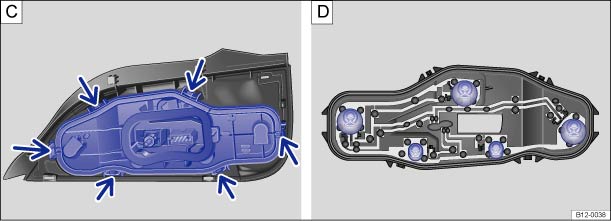 in die Rückleuchte einsetzen. Die Verrieglungslaschen (Pfeile) müssen hörbar