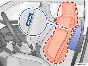 Abhängig von der Fahrzeugausstattung sind kombinierte Kopf- und Seitenairbags für die vorderen Sitzplätze eingebaut ⇒ Abb. 53 . Die kombinierten Kopf- und Seitenairbags befinden sich jeweils in den äußeren Sitzlehnenpolstern ⇒ Abb. 54 des Fahrersitzes und des Beifahrersitzes.