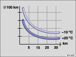 ⇒ Abb. 102 zeigt den unterschiedlichen Kraftstoffverbrauch für die gleiche Strecke, einmal bei +20 °C (+68 °F) und einmal bei -10 °C (+14 °F).