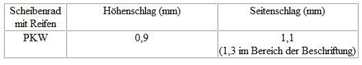 In der Tabelle sehen Sie die maximal zulässigen Toleranzwerte für das Rad mit dem montierten Reifen.