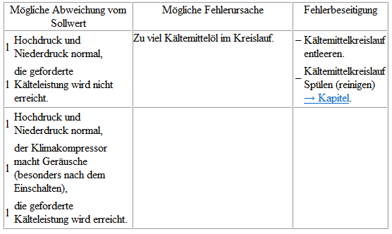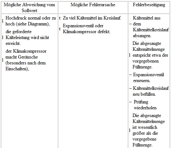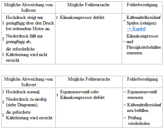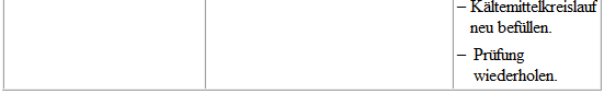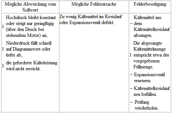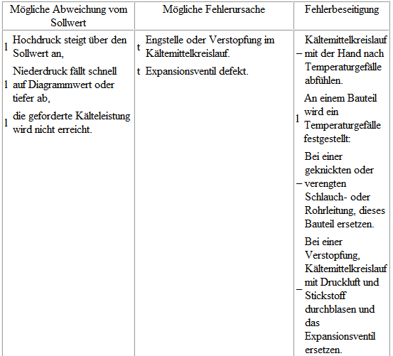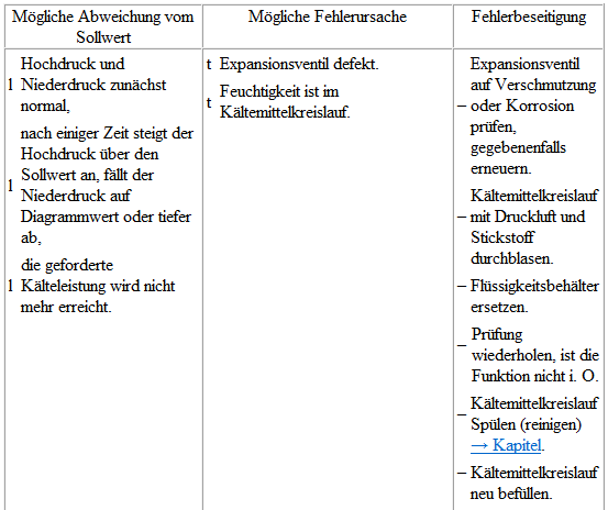 Ist die Funktion der Klimaanlage bei der Wiederholung der Prüfung der Prüfung nicht i. O., Expansionsventil rücktauschen, Kältemittelkreislauf mit Druckluft und Stickstoff durchblasen. Anschließend Klimakompressor und Flüssigkeitsbehälter erneuern.