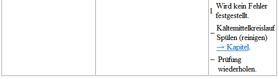 Kann kein Fehler festgestellt werden und ist die Funktion der Klimaanlage bei der Wiederholung der Prüfung nicht i. O. Kältemittelkreislauf mit Kältemittel R134a spülen (reinigen). Ist dies in dieser Werkstatt nicht möglich, Kältemittelkreislauf mit Druckluft durchblasen und mit Stickstoff entfeuchten.