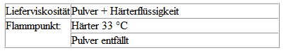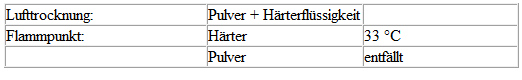 - Die beiden Komponenten werden im Verhältnis von 1 Volumen-Teil Härterflüssigkeit und 2,5-3 Volumen-Teile Pulver oder 10 Gramm Härterflüssigkeit und 58 Gramm Pulver zu einem spachtelfähigen Produkt gemischt.
