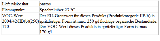 Dieser Spachtel ist leicht zieh- und schleifbar, mit hoher Standfestigkeit sowie hoher Temperaturfestigkeit, wodurch er sich insbesondere für das Überlackieren eignet.