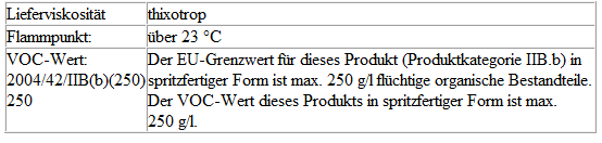 Die gewährleistete Lagerstabilität beträgt 12 Monate ab Herstelldatum. Spätestens verarbeitbar bis zum auf dem Etikett angegebenen Datum bei Lagerung in geschlossenen Originalgebinden bei +20 ºC.