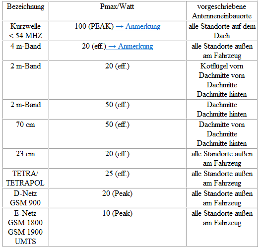 Tabelle Sendeleistungen und Antenneneinbauorte.