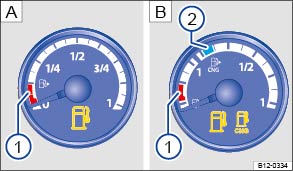 rote Markierung ① | Kraftstoffbehälter fast leer. Reservemenge wird verbraucht ⇒ Füllmengen . |