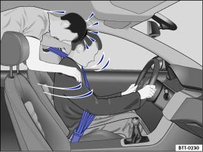 Schon bei geringen Aufprallgeschwindigkeiten werden am Körper Kräfte wirksam, die nicht mehr mit den Armen und Händen abgestützt werden können. Bei einem Frontalunfall werden nicht angegurtete Fahrzeuginsassen nach vorn geschleudert und schlagen unkontrolliert auf Teile im Fahrzeuginnenraum, wie z. B. Lenkrad, Instrumententafel oder Frontscheibe, auf ⇒ Abb. 42 .